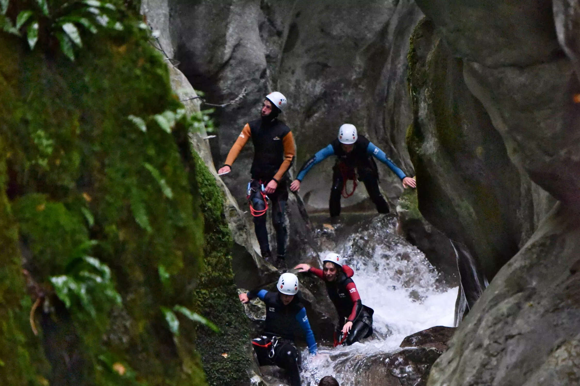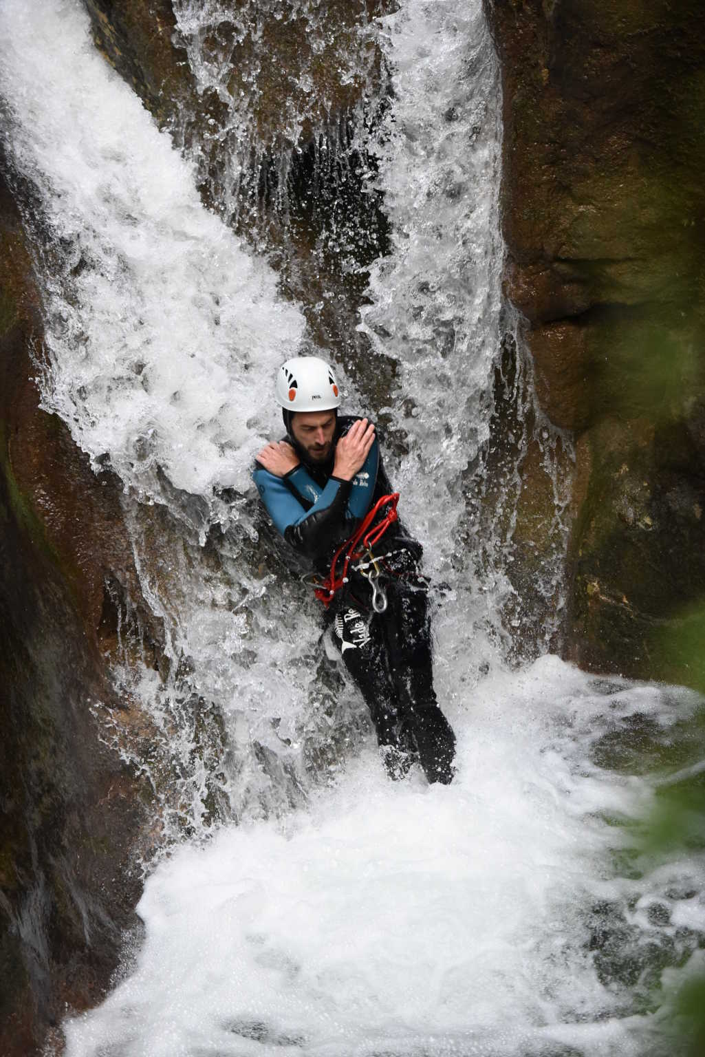 Nous commençons par la partie basse. L'ambiance est très aquatique avec de nombreux sauts, un siphon, des rappels et un joli passage en grotte. Après une pause casse-croûte, nous reprenons la voiture 10min pour rejoindre la partie haute. Tout y est : rappels, toboggans, sauts, nage, tyrolienne et siphons. Sauts, siphons et toboggans ne sont jamais obligatoire