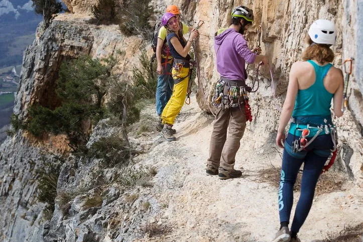 Via-ferrata : casque, baudrier et longes.