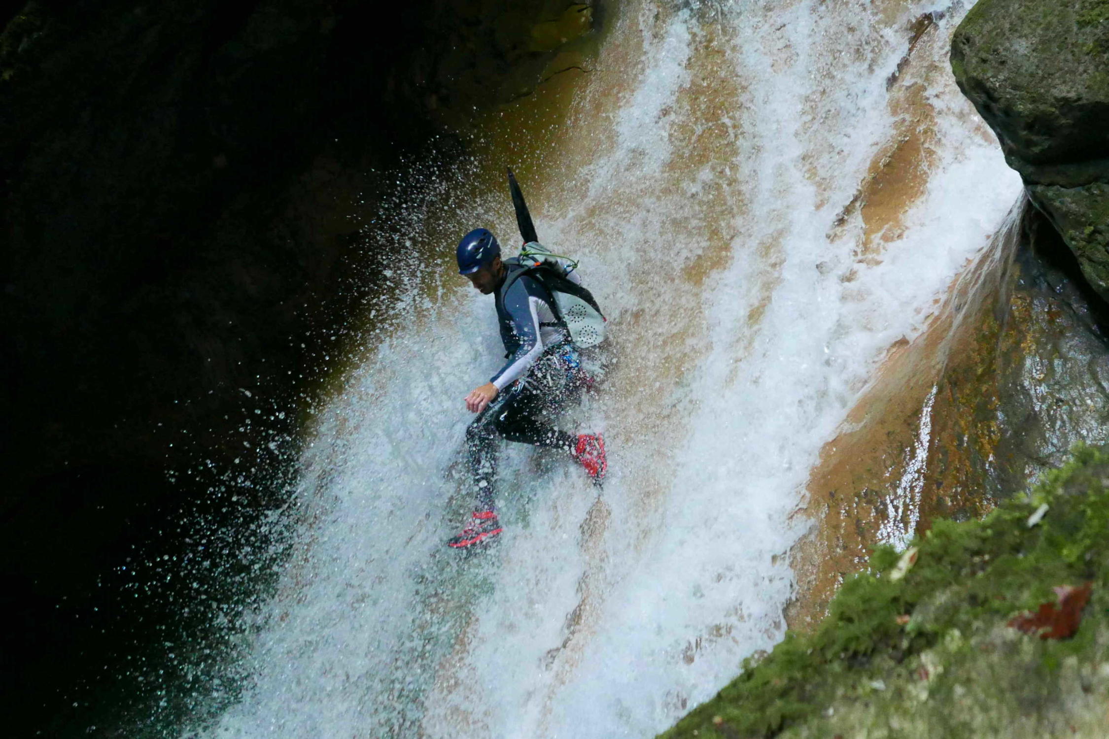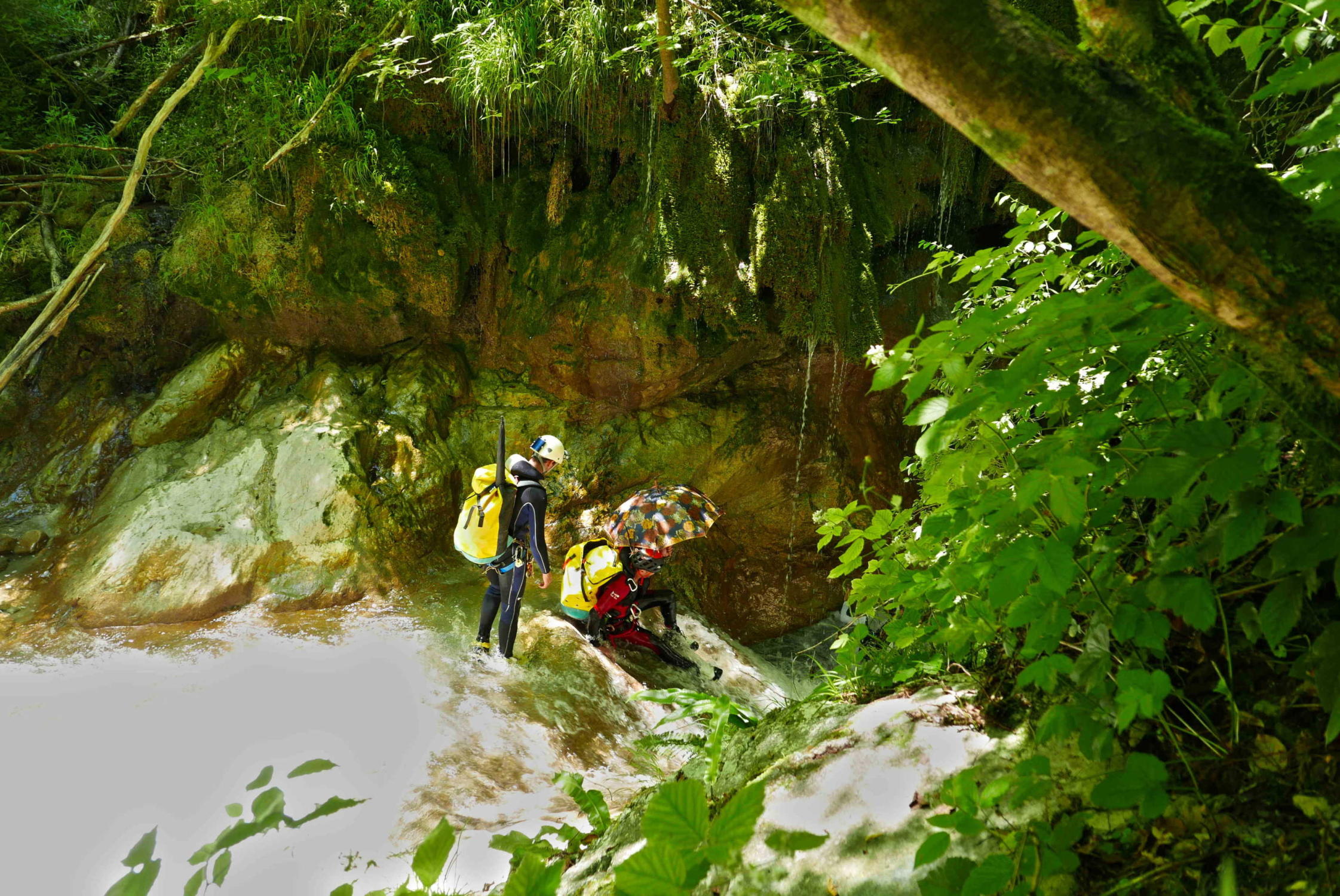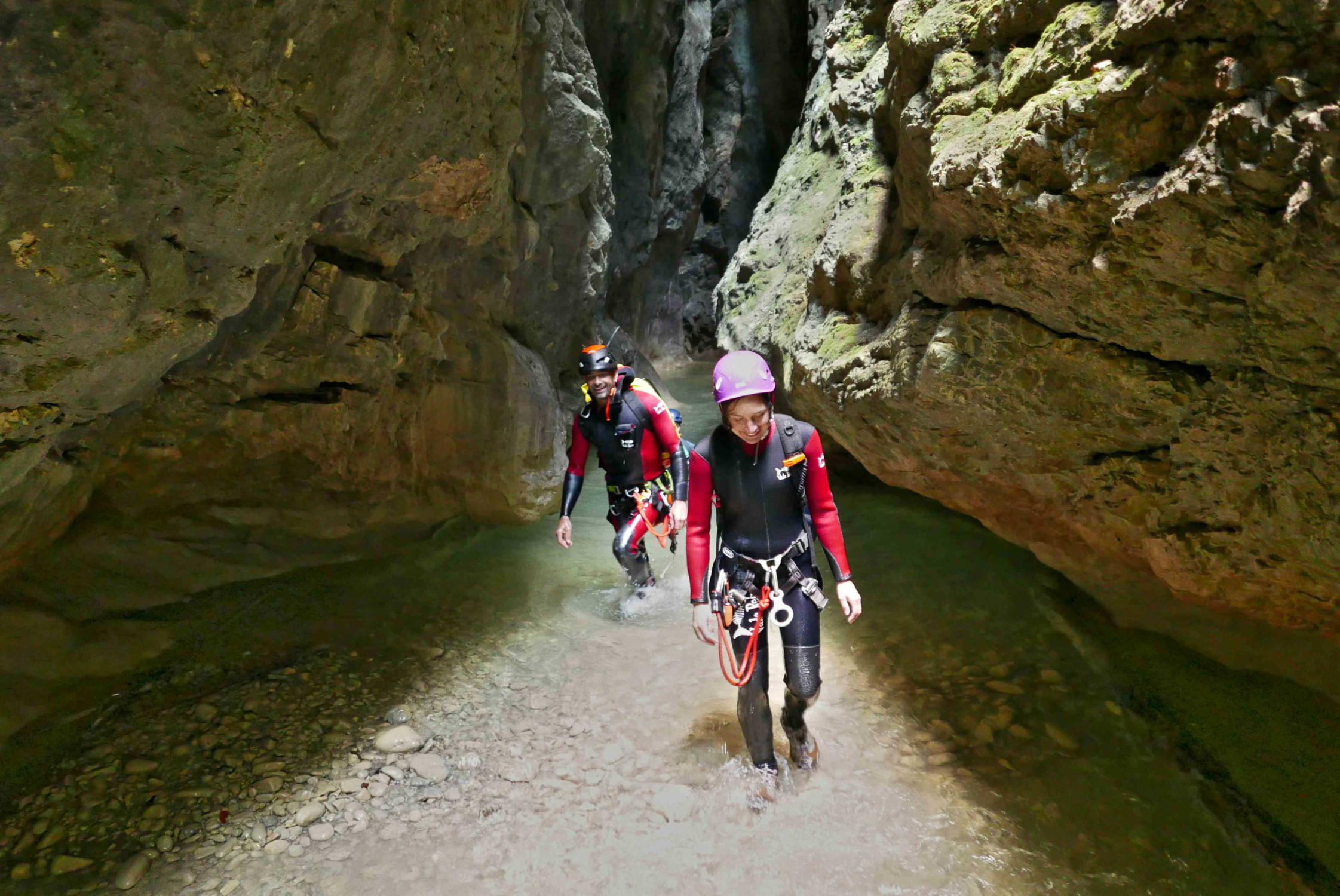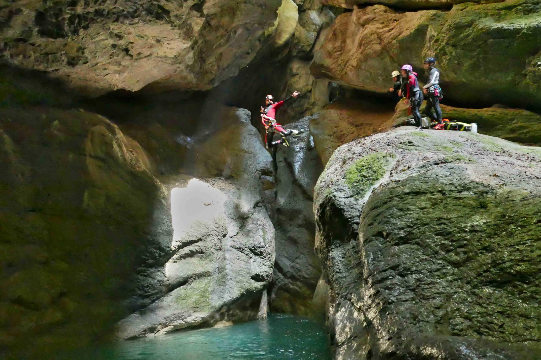 On commence la descente par un rappel de 30m qui nous amène directement au fond du gouffre où les parois font plus de 60m de hauteur. Après vous être remis de vos émotions on continue avec un bel enchaînement de sauts, de toboggans et de rappels. Sauts et toboggans ne sont jamais obligatoires.