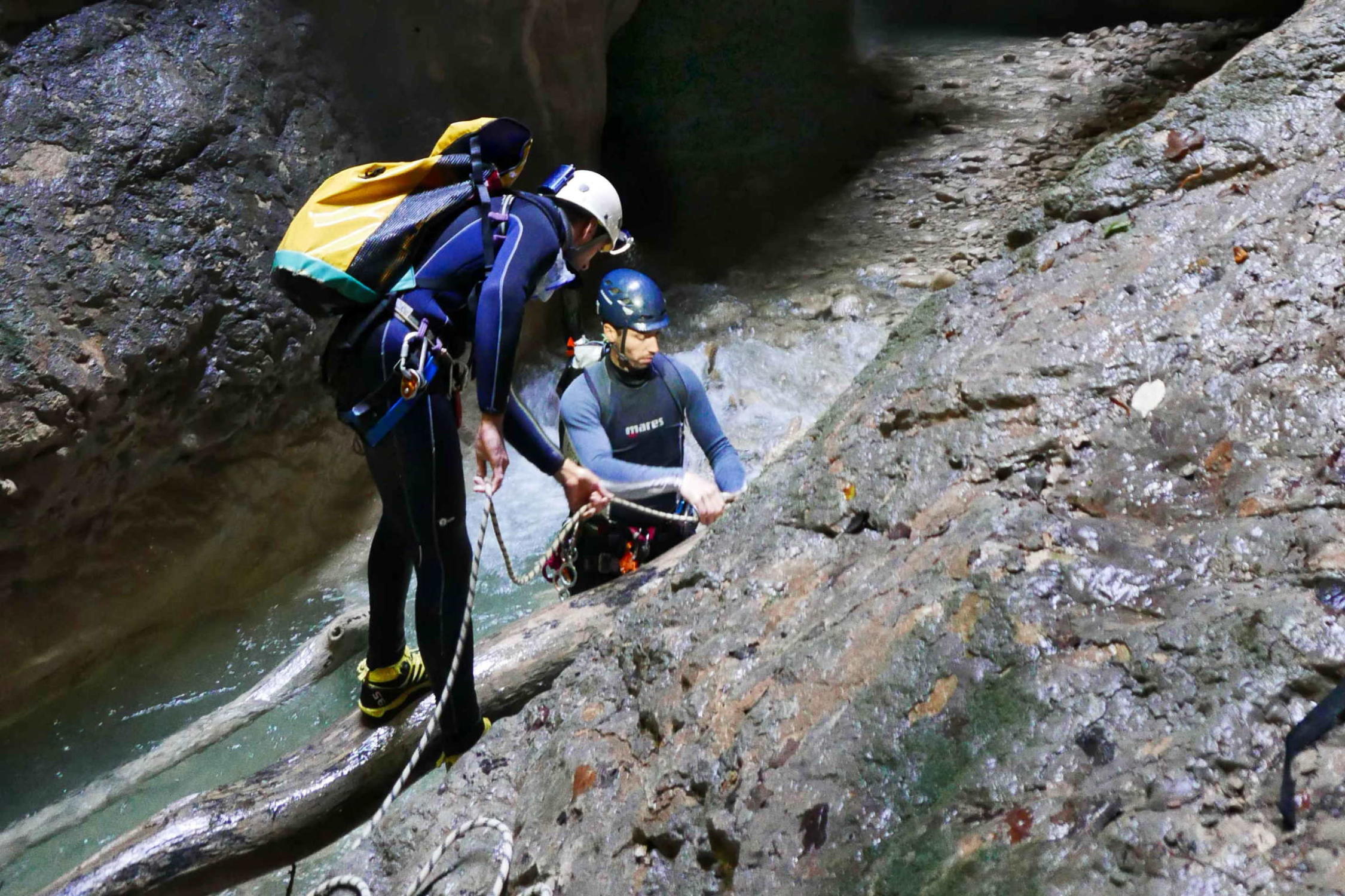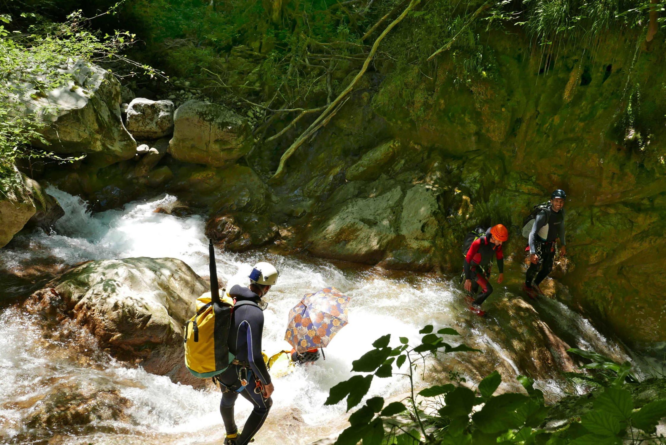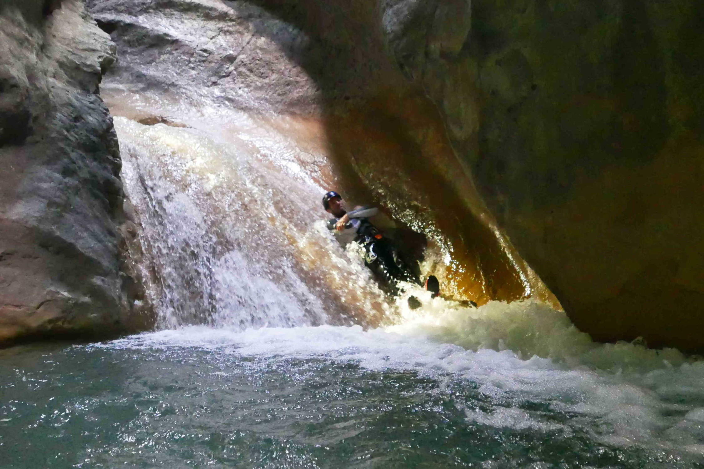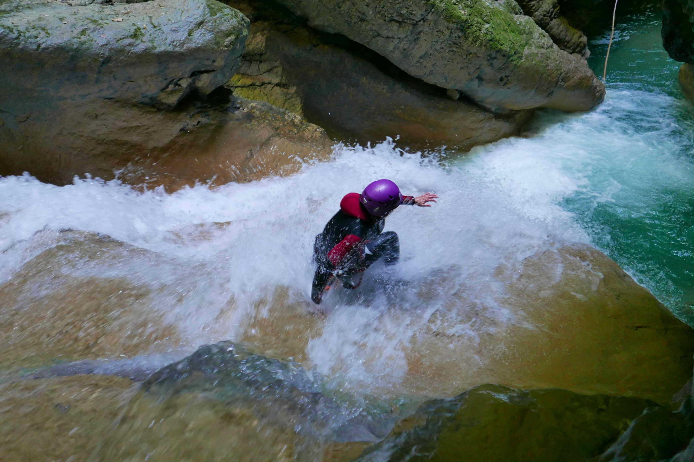 On commence la descente par un rappel de 30m qui nous amène directement au fond du gouffre où les parois font plus de 60m de hauteur. Après vous être remis de vos émotions on continue avec un bel enchaînement de sauts, de toboggans et de rappels. Sauts et toboggans ne sont jamais obligatoires.